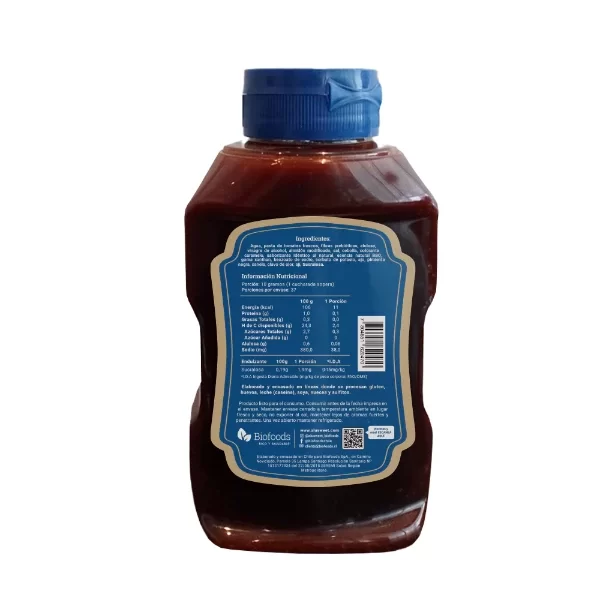 Ingredientes: Agua, pasta de tomates frescos, fibras prebióticas, alulosa, vinagre de alcohol, almidón modificado, sal, cebolla, colorante caramelo, saborizante idéntico al natural, escencia natural BBQ, goma xanthan, benzoato de sodio, sorbato de potasio, ajo, pimienta negra, canela, clavo de olor, ají, sucralosa.