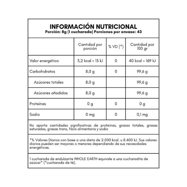 Valor Nutricional: Porción: 9g (1 cucharada); Valor energético: 3,2 Kcal = 13 KJ (0% VD*); Carbohidratos: 8g (2%VD*); Azúcares Totales: 8g; Azúcares Añadidos: 8g; Sodio: 0mg (0% VD); * % Valores Diarios con base a una dieta de 2.000 kcal u 8.400 kJ. Sus valores diarios pueden ser mayores o menores dependiendo de sus necesidades energéticas.